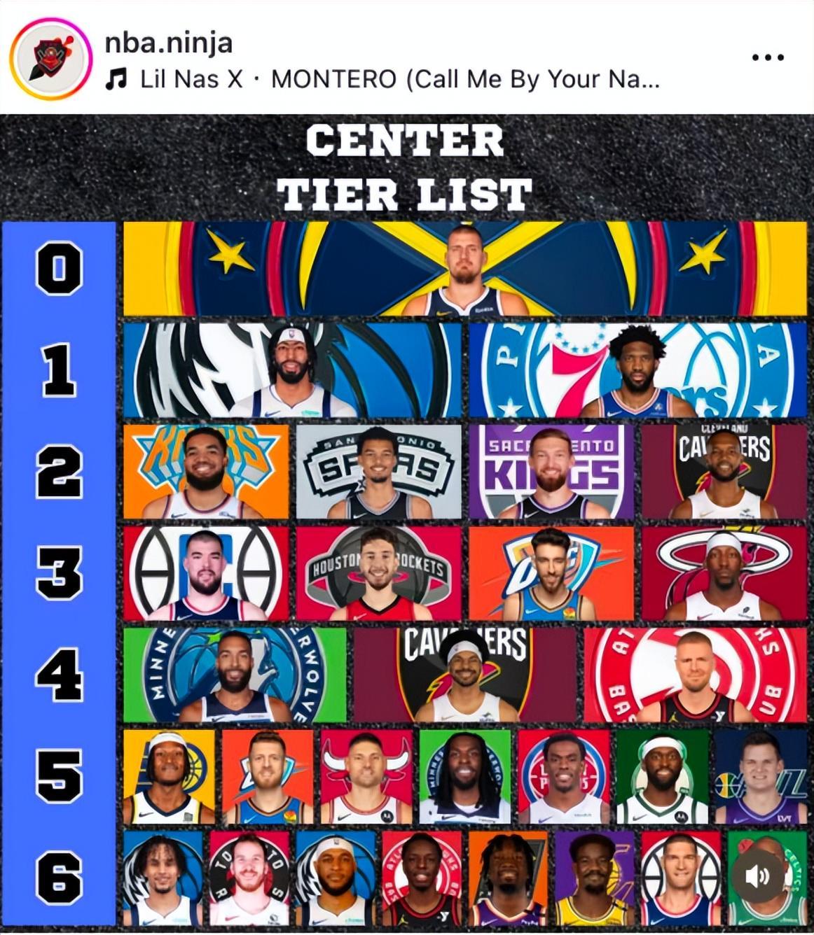 一天之前,美国媒体HoopsHype评选了25-26赛季联盟前26中锋,约基奇是毫无疑问的第一,文班亚马第二,唐斯第三,申京第四,恩比德第五,他们考虑了欧洲杯的发挥所以申京上升势头明显。一天之后,没想到NBA.NINJA为现役中锋分档出现了巨大的争议,或许他们没怎么关注欧洲杯与FIBA赛场。