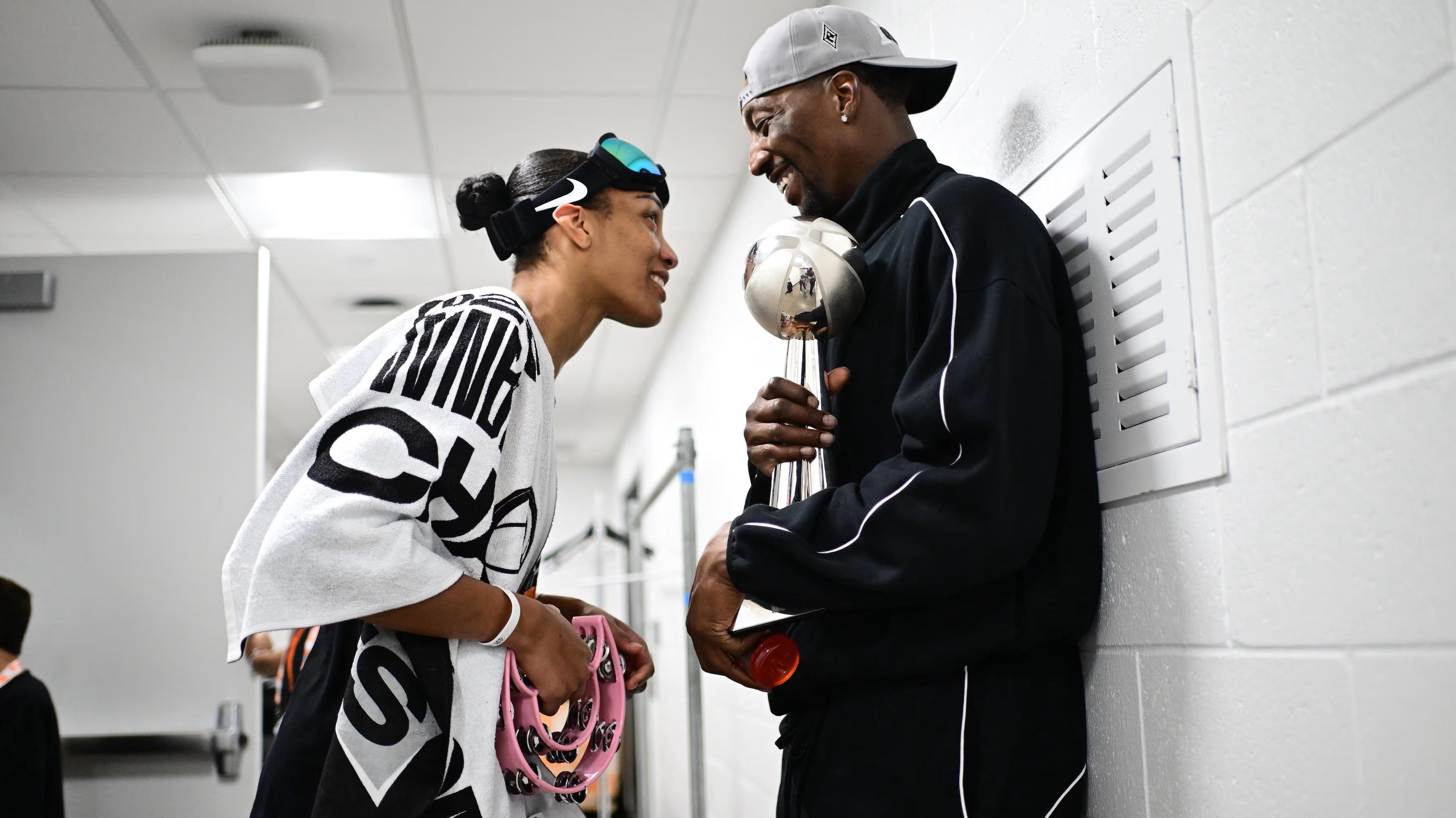 在今年WNBA总决赛中,率领王牌队夺冠的威尔逊在赛后喜极而泣,并与阿德巴约深情拥抱,坊间视这次拥抱为二人正式公开恋情的重要节点。随后在访谈中,阿贾-威尔逊曾表示,她很期待与阿德巴约养育自己的孩子。