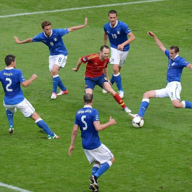 10年前的2012欧洲杯,西班牙对阵意大利的比赛留下了一张经典照片。伊涅斯塔被意大利队5名球员包围,他们都是效力于豪门的名将——基耶利尼、博努奇、马乔、马尔基西奥、莫塔。